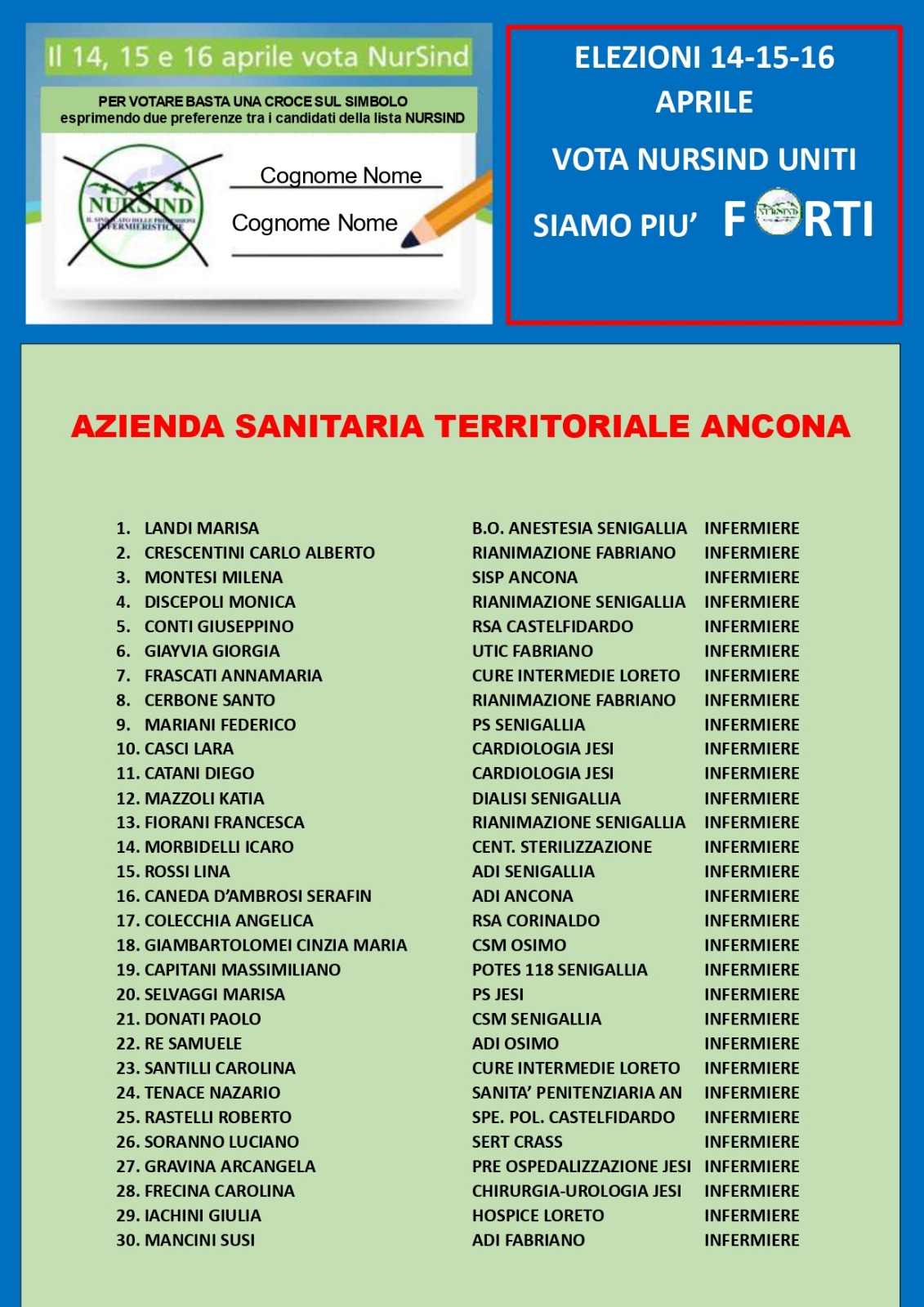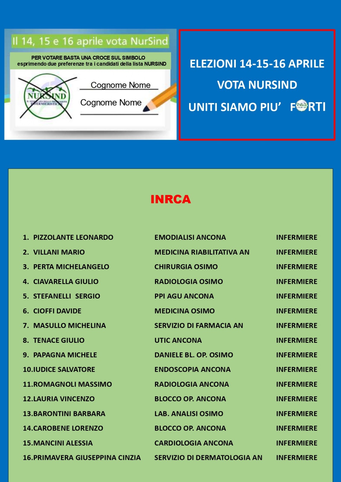 il 14, 15 e 16 aprile abbiamo un’opportunità unica: eleggere una RSU fatta da infermieri, colleghi che vivono ogni giorno la nostra realtà e conoscono le nostre sfide.