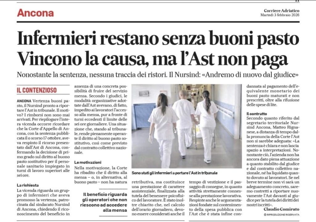 Vertenza buoni pasto, il Nursind pronto a riportare l’Ast in tribunale. Il motivo? I rimborsi non sono mai arrivati. Per riepilogare l’intera vicenda occorre ricordare che la Corte d’Appello di Ancona, con la sentenza pubblicata lo scorso 17 ottobre, aveva respinto il ricorso presentato dall’Ast di Ancona, confermando la decisione di primo grado sul diritto al buono pasto sostitutivo per il personale sanitario impiegato in turni di lavoro superiori alle sei ore.